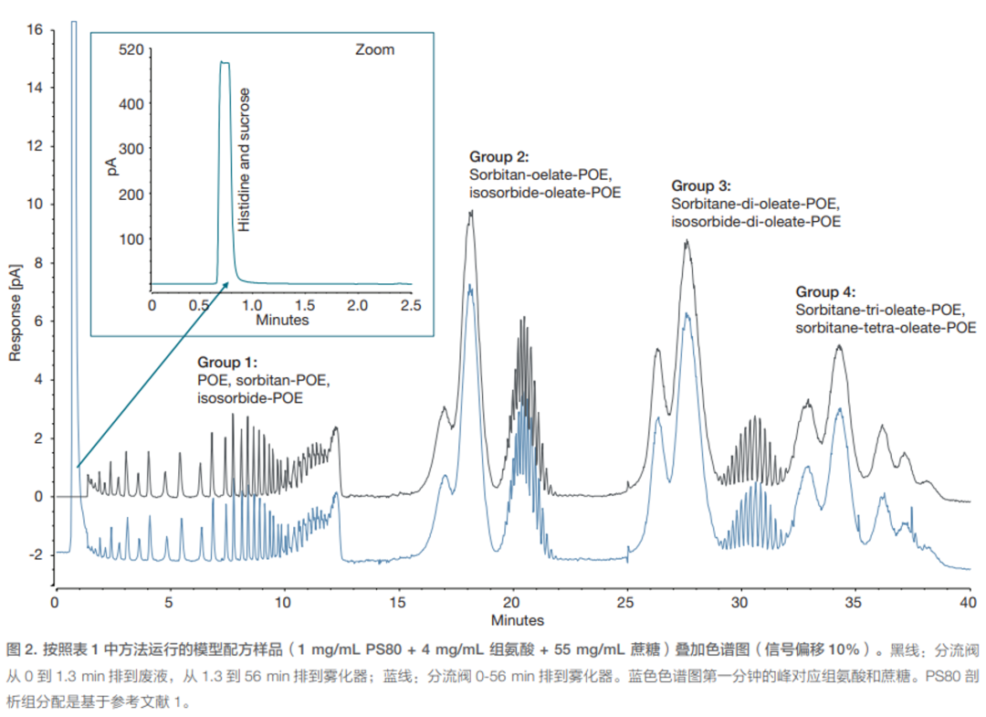 在吐温80的HPLC-CAD分析中,常见的配方成分(组氨酸和蔗糖)因其在C18色谱柱上不保留的特性,往往在色谱图前1分钟内快速洗脱,导致基线波动干扰和系统污染两大关键问题,从而影响第一组分峰面积的稳定性,以及高浓度辅料长期积累对检测器带来的损伤。