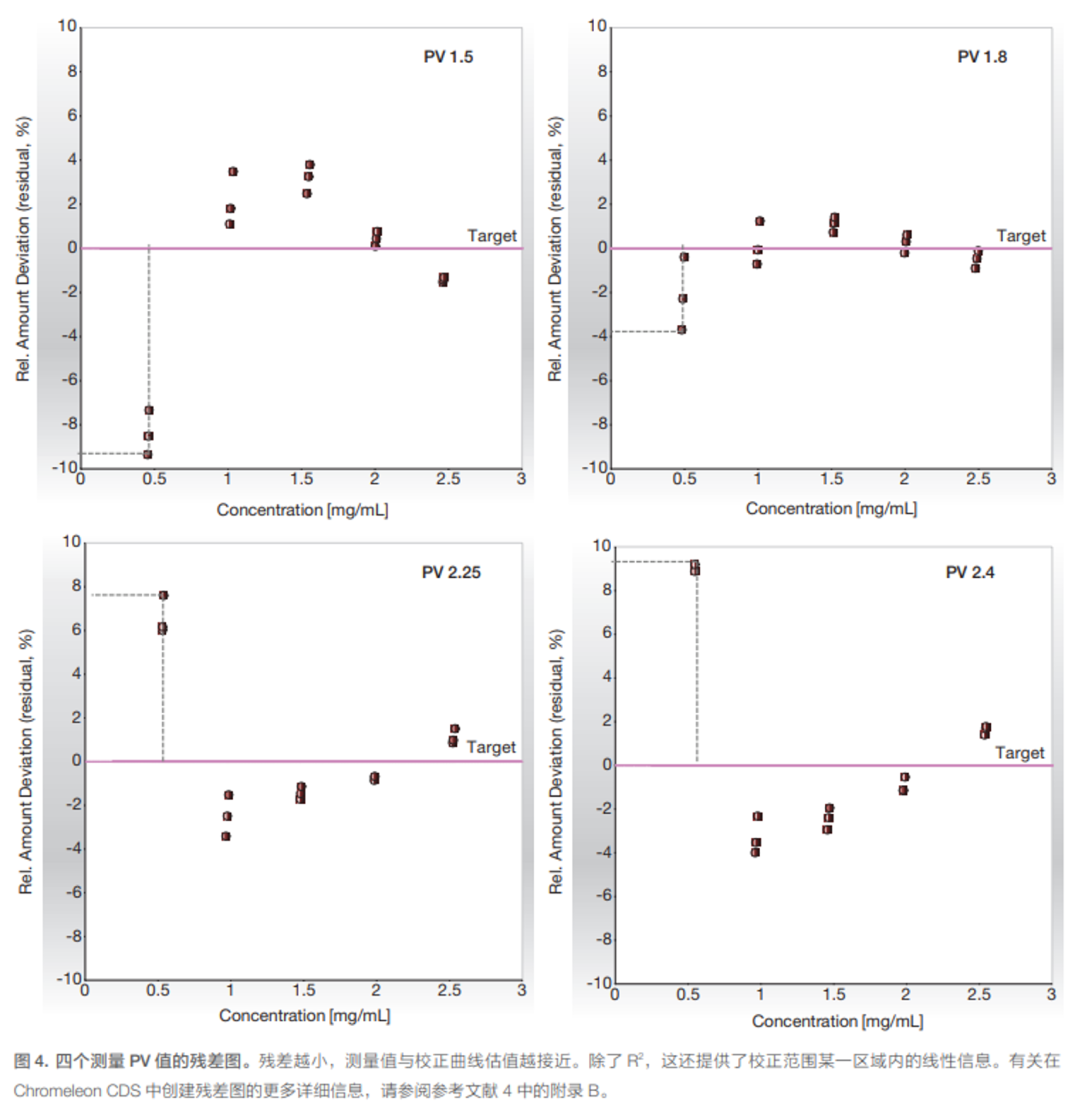 第七代Vanquish CAD HP的四通道PV同步采集技术带来革命性突破,通过单次进样同步采集1.5(最低)、1.8(默认)、2.25、2.4(最高)四个PV值通道数据,通过智能线性优化,全自动比对相关系数(R²)和残差(相对量偏差),从而得到最佳PV值,使得吐温80 在0.5-2.5 mg/mL范围内线性相关系数R²>0.9997,低浓度点(0.5 mg/mL)残差小于4%,大大提升了准确度。